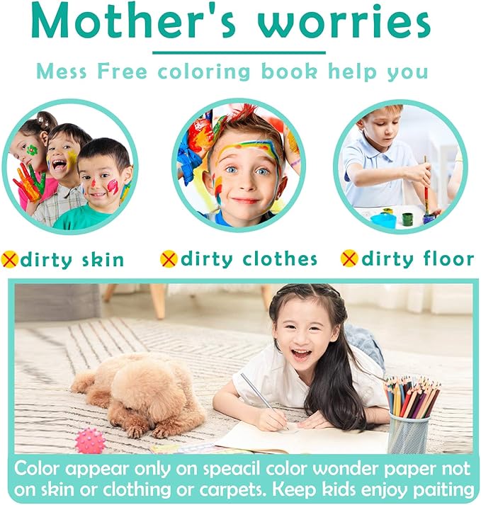 - Mess Free Coloring Activity Kit: Colors appear only on special Color paper not on skin clothing or carpets; Keep kids happy through many long road trips, plane rides, sleepovers, rainy days, and more; Ideal birthday gift for kids of all ages