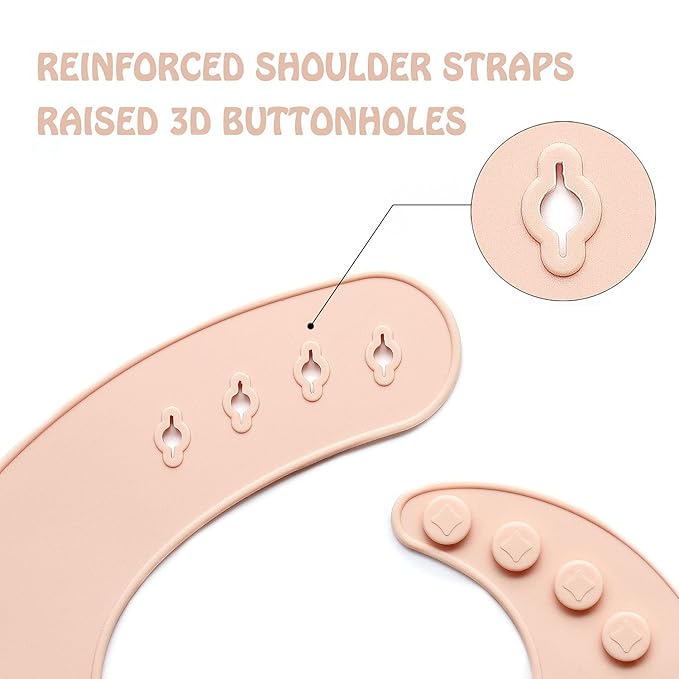 • SILICONE BIB – The silicone baby feeding bib has a big food catcher that could stay open. So, it could catch most of the falling foods & drinks. The tightening buttons secure the silicone bibs well and make it harder for toddlers to pull it apart. It fits for the little ones in age of 6 ~ 36 months.