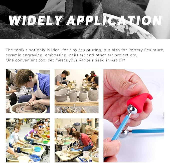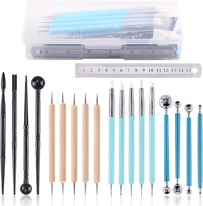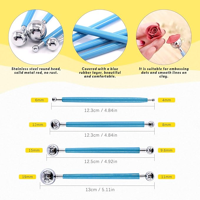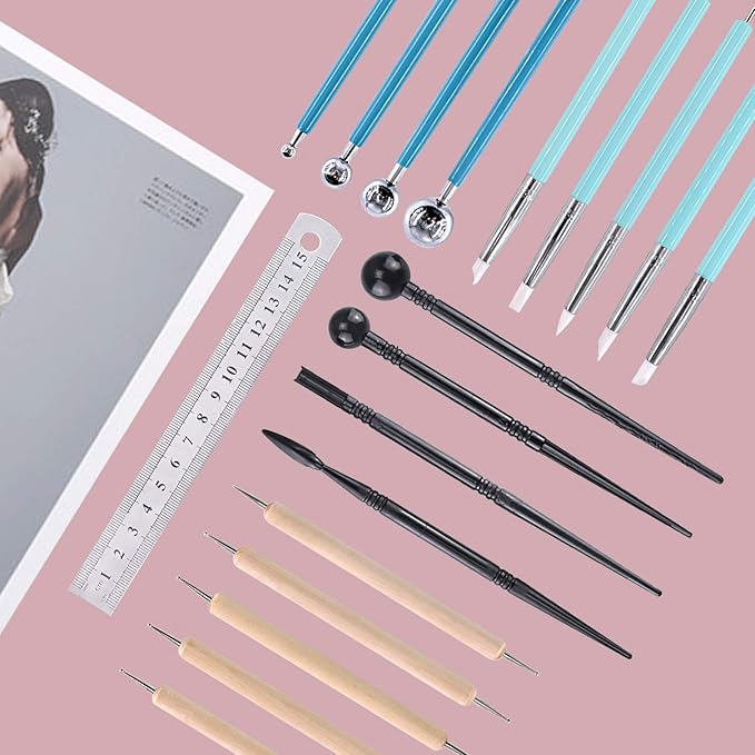 - ❤ What You Get ----- In this kit, You will get 19Pcs Modeling Clay Sculpting Tools Kits, You will get 4Pcs Plastic Ball Rod Stylus Modeling Tools; 4Pcs Ball Stylus Tool; 5Pcs Dual-ended Dotting Design Pottery Tools; 5Pcs Wooden Dotting Tools; 1Pcs Ruler for Cake Fondant Decoration and Nail Art Pottery Modeling Clay.