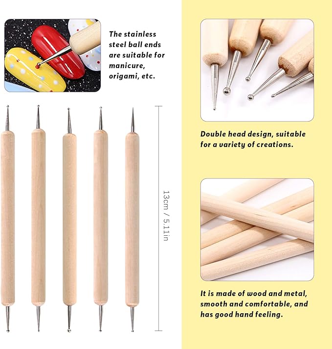 - ❤ 5Pcs Wooden Handle Double-Sided Set ----- Double sided: Each piece of wooden clay tools is double sided and comes with an easy to grip handle. Variety Shape: A wide variety of 10 shapes good for detail work in pottery and sculpture. There are 5 pieces of double-ended metal ball tools, and both sides have balls of different diameters, thus there are 8 balls for you to use.