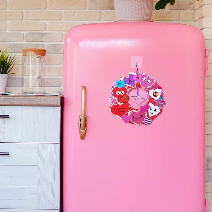 - Quantity: Heart Wreath Decorations DIY Foam Wreaths Craft Kit includes 12 pcs round foam wreath bases, 138 pcs heart foam stickers feature assorted patterns, 48 pcs heart foam stickers in 4 solid colors, 24 pcs glitter heart foam stickers in 2 colors, 12 pcs foam heart tags in 3 colors, 72 pcs black googly eyes, 12 pcs satin cords in 5 colors, 1 sheet of rhinestone stickers, 12 pcs adhesive wall hooks, and 1 pcs black marker pen.