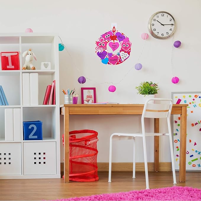 • Color: DIY Heart wreath bases are in red. Patterned heart stickers feature red, rose, pink, light pink, purple and white. Solid color heart stickers feature rose, pink, hot pink, and blue. Glitter heart stickers feature red and light purple. Heart tags are in red, pink, and hot pink. Satin cords are in red, rose, pink, purple, and light purple. Adhesive wall hooks are transparent.