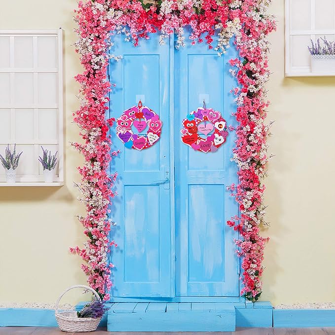 • Quantity: Heart Wreath Decorations DIY Foam Wreaths Craft Kit includes 12 pcs round foam wreath bases, 138 pcs heart foam stickers feature assorted patterns, 48 pcs heart foam stickers in 4 solid colors, 24 pcs glitter heart foam stickers in 2 colors, 12 pcs foam heart tags in 3 colors, 72 pcs black googly eyes, 12 pcs satin cords in 5 colors, 1 sheet of rhinestone stickers, 12 pcs adhesive wall hooks, and 1 pcs black marker pen.