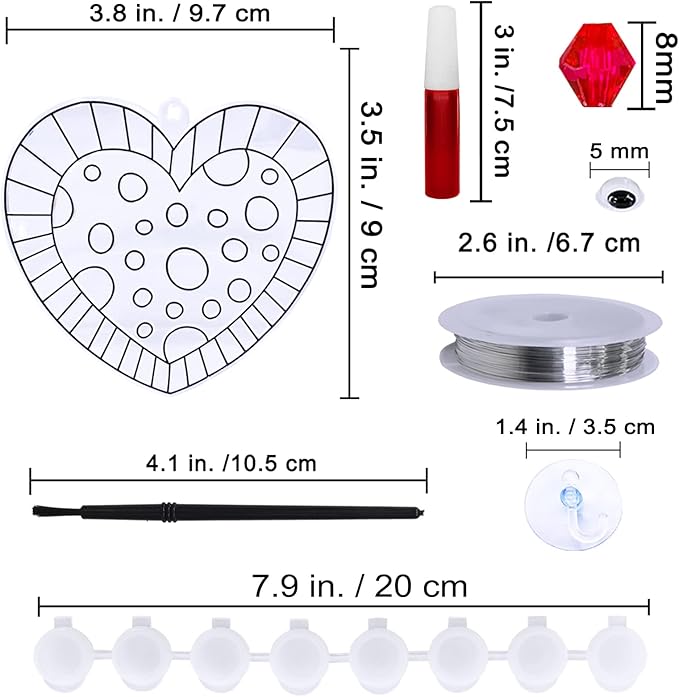 - 27 Sets Heart Suncatchers Ornaments Decoration DIY Craft Kits, including 27 pcs heart suncatchers in 9 styles, 300 pcs acrylic beads, 20 bottles of 8 valentine colors acrylic paints (6ml per bottle), 27 pcs paintbrushes, 1 empty paint pot strip with 8 pots, 20 pcs googly eyes, 27 pcs suction hooks, 1 roll fishing thread. Each suncatcher comes with a small loop on the top that can be used to create a hanger. With all in one package, kids can enjoy the DIY project conveniently.