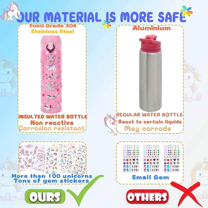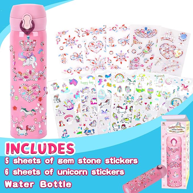 - 【TONS OF GEMS & UNICORNS】The craft kit comes with 11 sheets of glitter gems and unicorn stickers, more than enough to create your own water bottle with tons of left overs