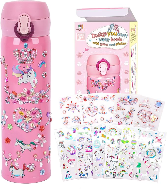 YOFUN Decorate Your Own Water Bottle with 11 Sheets of Unicorn Stickers & Glitter Gems, Craft Kit & Art Kit for Children, Gift for Girls Age 4 5 6 7 8 9 10 Years Old Kids, BPA Free Insulated (Pink)