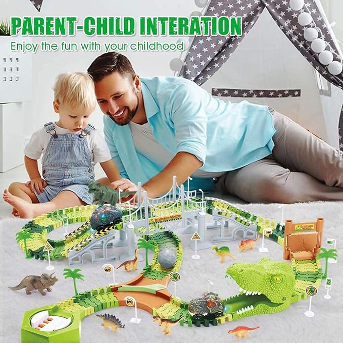 - Children Friendly & Premium Quality Racetrack - Our dinosaur road race set assured that all are parts made of eco-friendly ABS. No harmful to kids. Parents can spend sweet time with little children and keep them away from electronic gadgets. Conforms to US toy standards. It is suitable for toddlers boys and girls 3 4 5 6 years old.