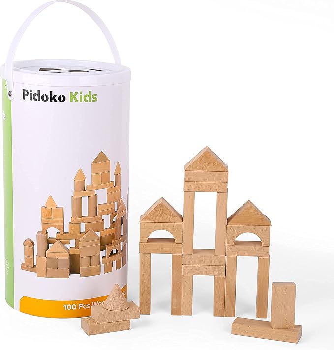 Pidoko Kids Wooden Blocks - 100 Pcs - Building Blocks for Toddlers - Includes Storage Container with Shape Sorter Lid - Natural Beech Wood Blocks - Preschool Learning Toys Stacking Block