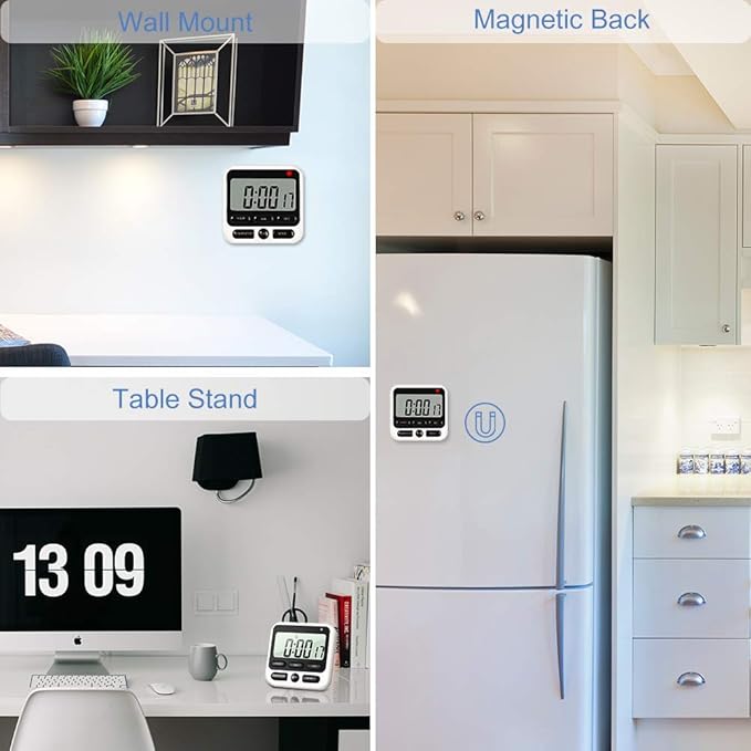 - Upgraded Magnetic back -The kitchen timers is convenient to place in three ways especially its upgraded 3 strong magnet working fine on metal surface, Don't worry about the falling problems that Often occur with other timers. Suitable for limited time activities in daily life, especially cooking.