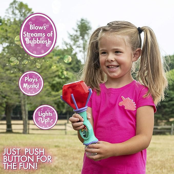 - Lights and Sound Bubble Wand lights up and plays whimsical music all while blowing tons of bubbles