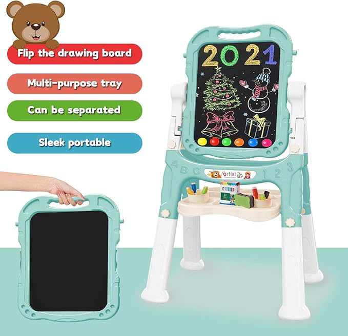 • 🎈360°Double-sided Magnetic Art Easel: Our art easel is equipped with a magnetic dry erase board and a whiteboard. The whiteboard supports watercolor painting, while the blackboard can be used to practice calligraphy and study. It is equipped with a complete range of professional painting tools and can be rotated 360 degrees to satisfy children various painting needs.