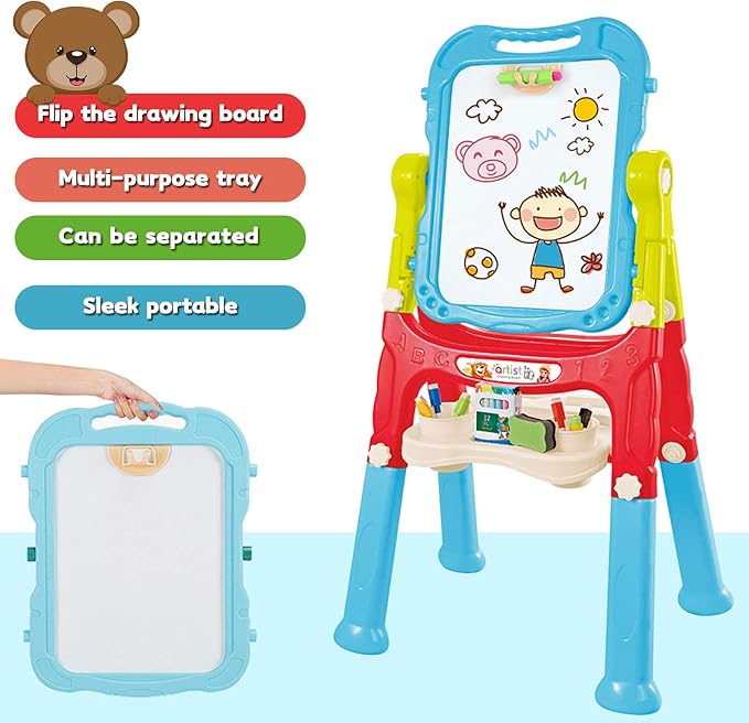 - 🎈360°Double-sided Magnetic Art Easel: Our art easel is equipped with a magnetic dry erase board and a whiteboard. The whiteboard supports watercolor painting, while the blackboard can be used to practice calligraphy and study. It is equipped with a complete range of professional painting tools and can be rotated 360 degrees to satisfy children various painting needs.