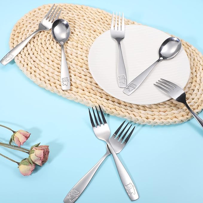 - ❤️Cute engraved bear: the end of each kids silver utensils feature a cute bear pattern, the lovely design can easily find favor with children in different ages and genders such as juniors, toddlers, preschoolers, school age children and so on
