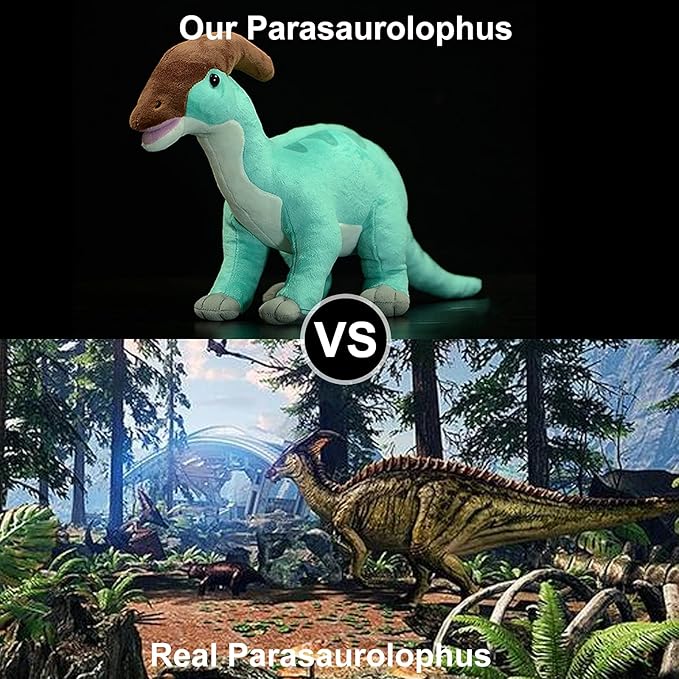 - HIGH QUALITY FABRIC: Our parasaurus dinosaur is made of high-quality velvet fabric, and it feels very good.The inside is filled with high-quality sponge, which makes the dinosaur look fluffy and soft. I believe you will like it after receiving the goods.