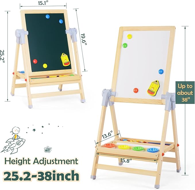 - 【Child-Friendly Design】Adjustable height and multi-function design, kids painting easel can adjust from 25.2 inch to 38 inch, when the drawing easel is rotated to be flat, it can be used as an kids art table or a painting desk.Our easels for kids are perfectly sized for kids ages 2-8.