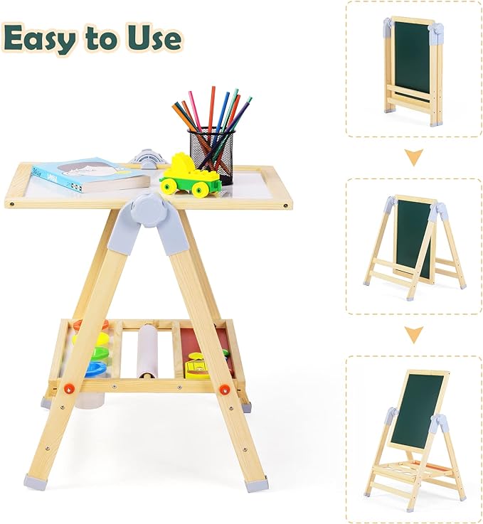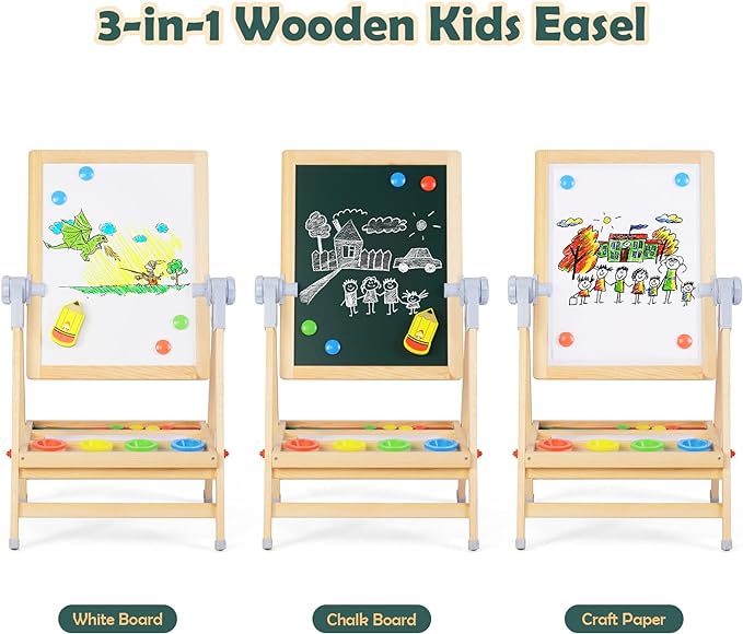 - 【3-In-1 Art Easel】This wooden easel features double-sided drawing board and a paper roll. Blackboard can be painted with chalks for exquisite works, while the whiteboard allows kids to paint with marker pen for dust-free use. They can also roll out the paper and fix it with 2 magnetic beads, creating extra drawing space.With a sturdy wooden construction + built-in wooden tray to hold all their art supplies.