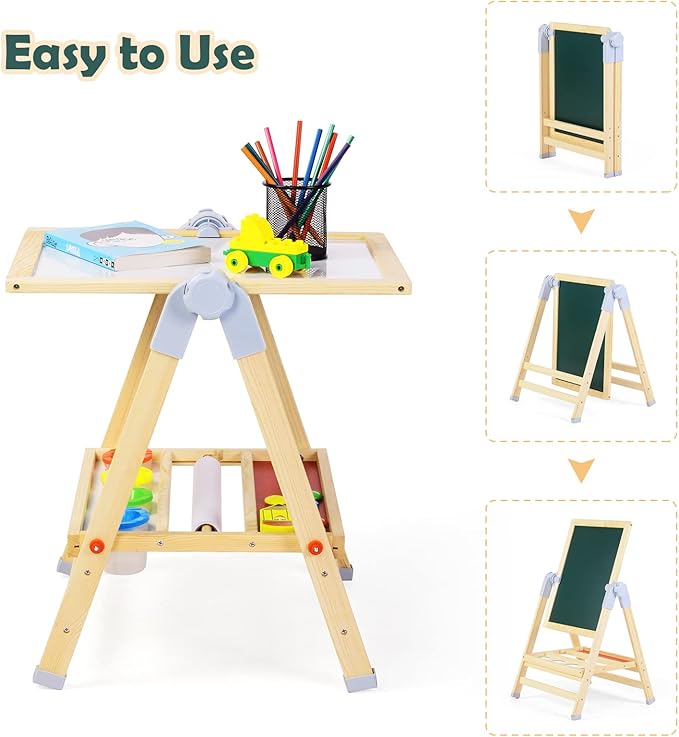 - 【3-In-1 Art Easel】This wooden easel features double-sided drawing board and a paper roll. Blackboard can be painted with chalks for exquisite works, while the whiteboard allows kids to paint with marker pen for dust-free use. They can also roll out the paper and fix it with 2 magnetic beads, creating extra drawing space.With a sturdy wooden construction + built-in wooden tray to hold all their art supplies.