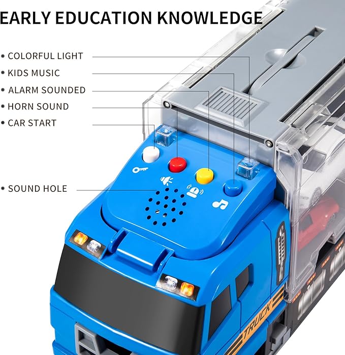 - Enrich Early Education Knowledge - Our upgraded version of the race cars toy has a good early education function. Through the 4 buttons on the front of the truck, your child will see cool lights, hear the sound of the vehicle starting, the sound of the horn, the realistic police sound and the pleasant music. It is very suitable for parent-child education and cultivate children's imagination and creativity. There is a need for 2 AAA batteries (not included).