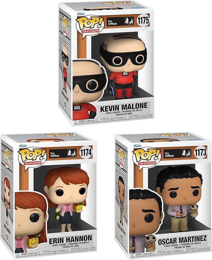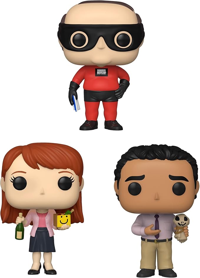 - Includes: Erin with Happy Box & Champagne, Kevin as Dunder Mifflin Superh, Oscar with Scarecrow Doll.
