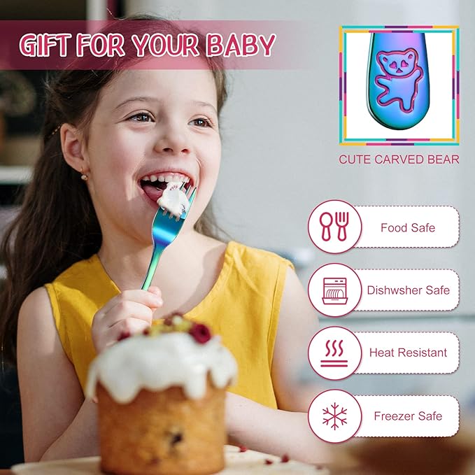 - Rainbow colors: these kid metal forks are designed with rainbow color, and the flat handles are engraved with vivid bears, which can easily attract children's attention and get their love, allowing them to take the fork to eat
