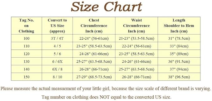 • Size for toddler girls and little kids: 3T to 4T, 4T to 5T, 5-6, 6x-8 and 8-10. Age is only an approximation of size. Please measure the actual body size and refer to the size chart to choose a proper size for best fit. There may be minor size difference depending on size measuring method.