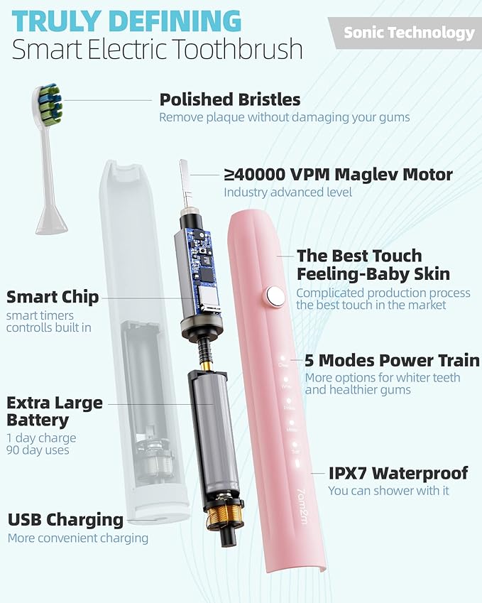 7AM2M Sonic Electric Toothbrush for Adults and Kids with 8 Brush Heads and Travel Case,5 Modes with 2 Minutes Build in Smart Timer, One Charge Use for 90 Days, Rechargeable Toothbrushes(Pink)