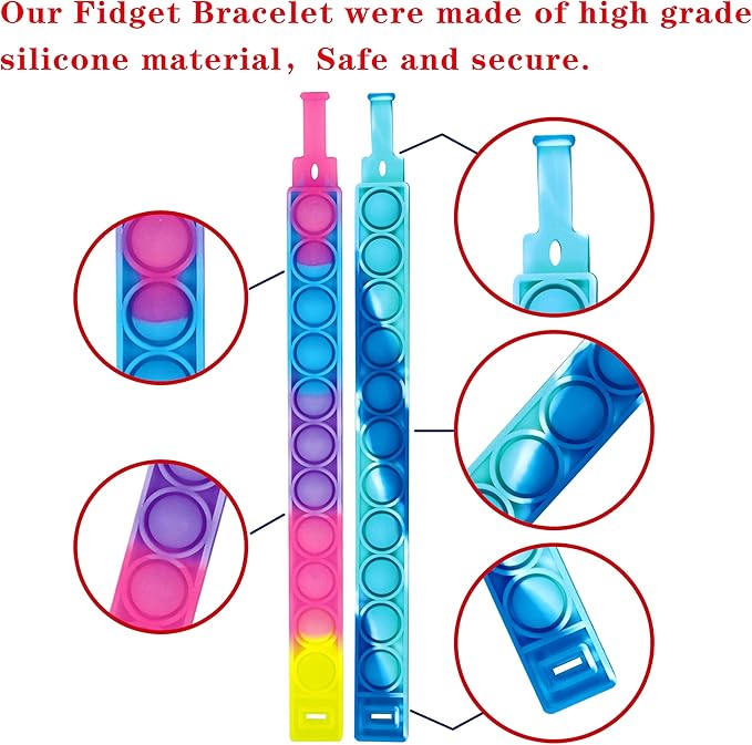 - 【Bracelets Bulk】— These Pop fidget bracelet packs are durable, reusable, and portable. The fidget toy set is suitable for children as well as adults. These sensory fidget toys are very simple to use, you can have endless fun by flipping, kneading.