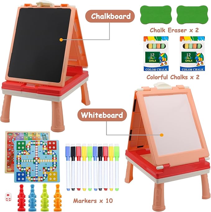 - Double-sided Board: Our kids art table easel contains a whiteboard and blackboard for both learning and entertainment. The package contains accessories such as brushes, erasers, flying chess, etc. Ruikytech tabletop easel is great to support multiple children to create drawing or playing flying chess together