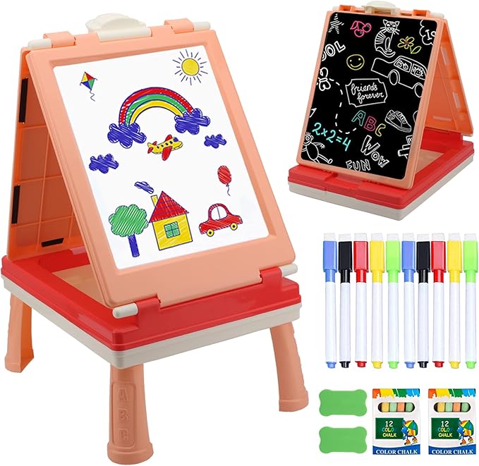 Table Art Easel for Kids, Double Sided Foldable Tabletop Drawing Easels Chalkboard Desk with Graffiti and Board Game Accessories Supplies for Boys and Girls (Pink)