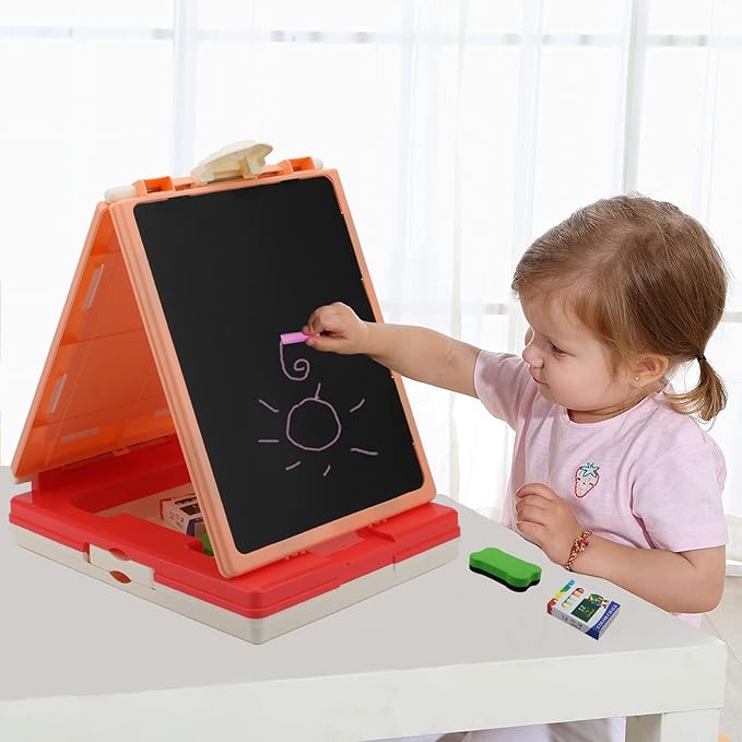 - Double-sided Board: Our kids art table easel contains a whiteboard and blackboard for both learning and entertainment. The package contains accessories such as brushes, erasers, flying chess, etc. Ruikytech tabletop easel is great to support multiple children to create drawing or playing flying chess together