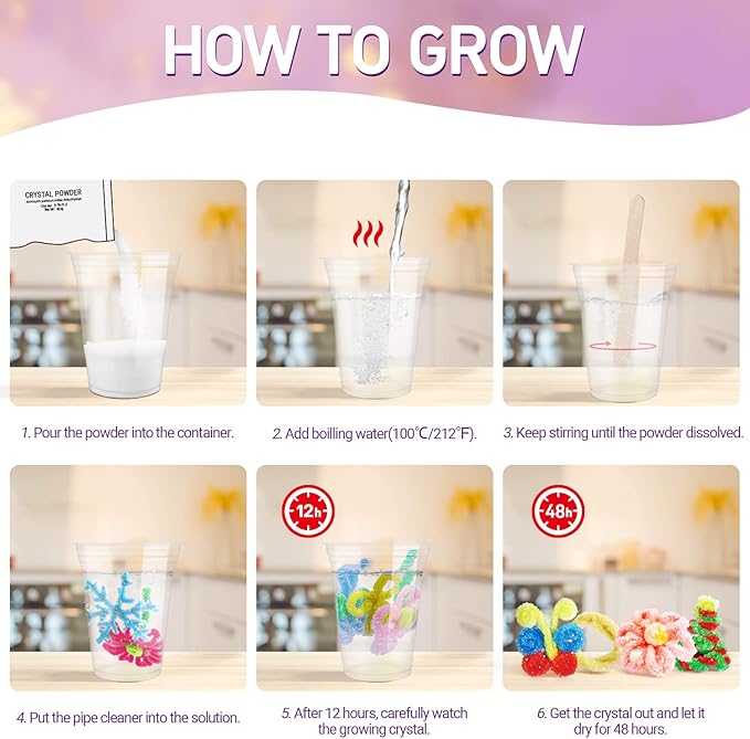 - Grow Flower Crystals: Make science experiment easier. Create 12 crystals of different shapes,develop your kids patience and stimulate their imagination.This is a simple and fun nearly-science art and craft kit,great art and STEM project for them to do. This is a fun activity for everyone in the family !