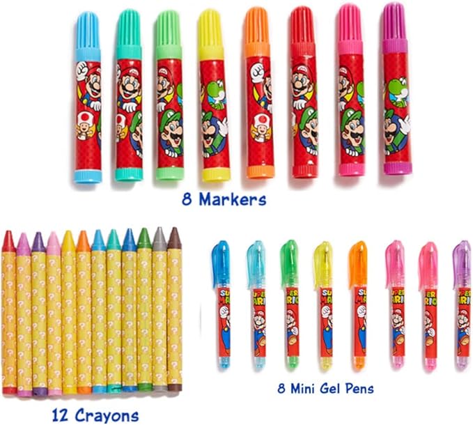 - 500+ PC. MARIO BROS ART SUPPLIES - All the art supplies kids need are included in this fun activity set! They can stamp, color, draw, sticker, and even give themselves tattoos.