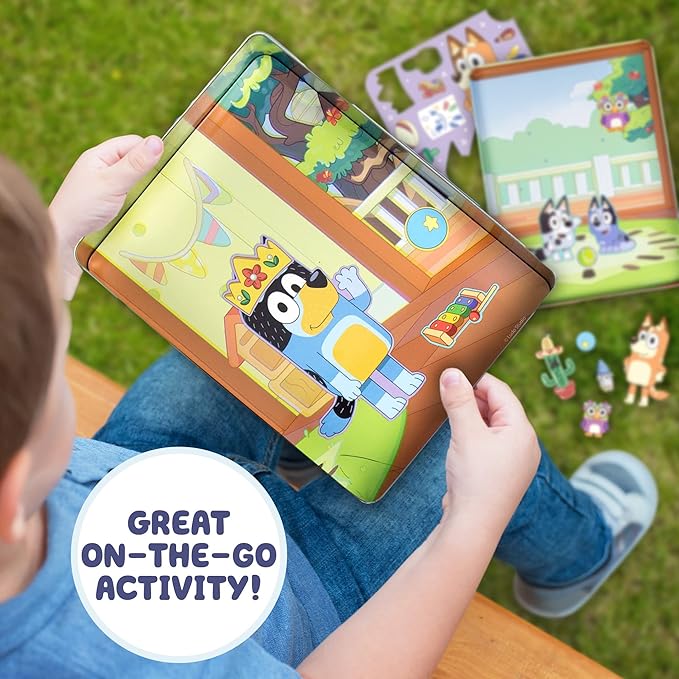 • ALL YOUR FAVORITE BLUEY CHARACTERS: Punch out your favorite cast of characters from the magnetic sheet, including Grandad, Nana, Bandit, Chilli, Bluey, Bingo, Muffin, then place them inside the tin to create your own adventures!