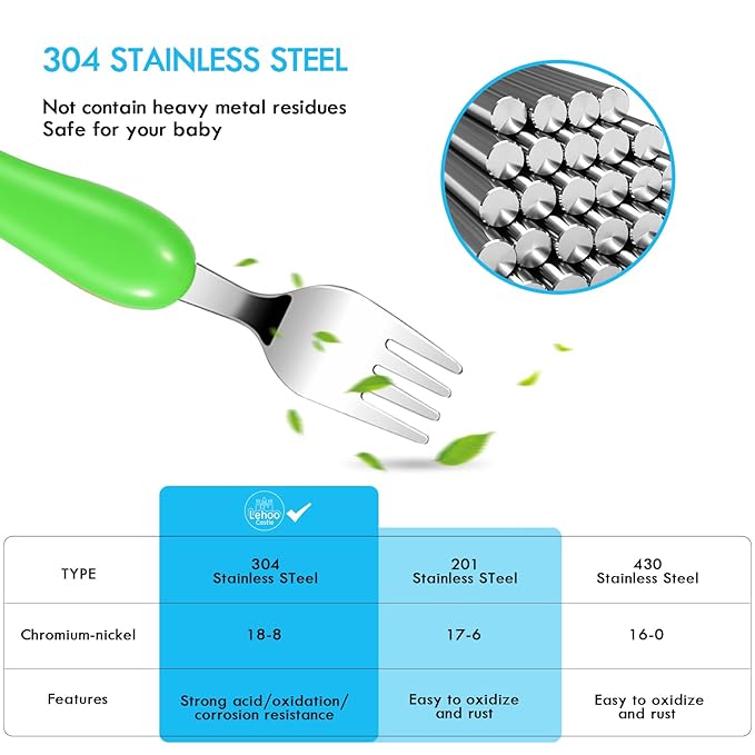 • SAFE TODDLER UTENSILS SET: Made of durable food grade stainless steel, all non-corrosive, BPA-free and easy to clean (NOT dishwasher safe to avoid color loss)