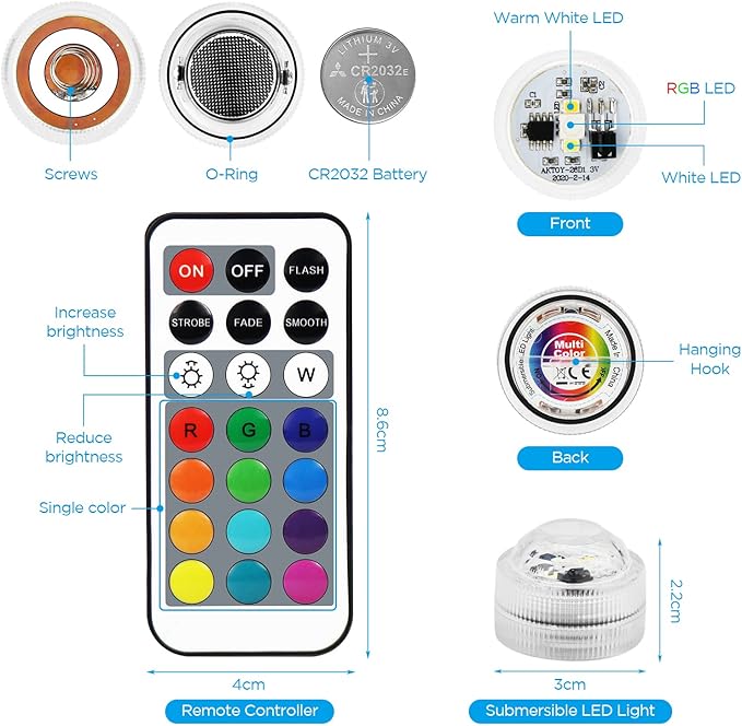 - 【NOTE】: The Submersible light and the 2 LED strings including the remote control require the battery isolator to be removed before use. In addition, the remote control can only control the dive light, not the 2 LED strings. 2 LED strings can be used to select the light mode (chasing light, flashing light, steady light) by pressing the button.