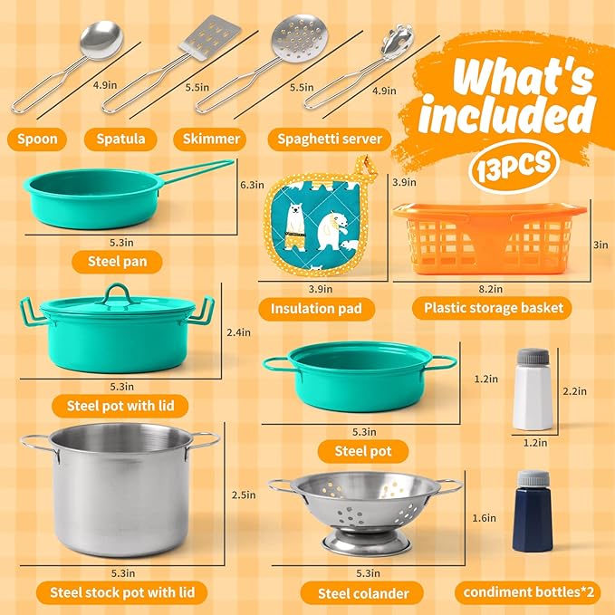 - πγ Kids Play Kitchen Accessories γβ 14PCS set includes: One colander, one stockpot, one pan and one low pot, comes with one covers, one spatula, one ladle, one draining spoon, one spaghetti server, one table mat and 2 spice bottles. There is also a carrying basket to store all the kitchen utensils.