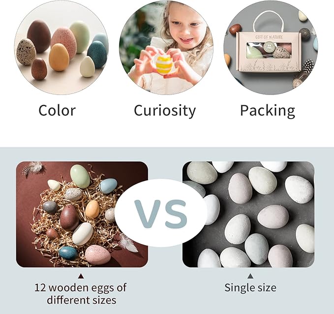 - EXQUISITE GIFTS: 12 pieces of wooden eggs set are packaged in exquisite gift boxes. To protect the eggs and reproduce the real scene, we also added artificial Raffia inside the package to protect the easter egg!