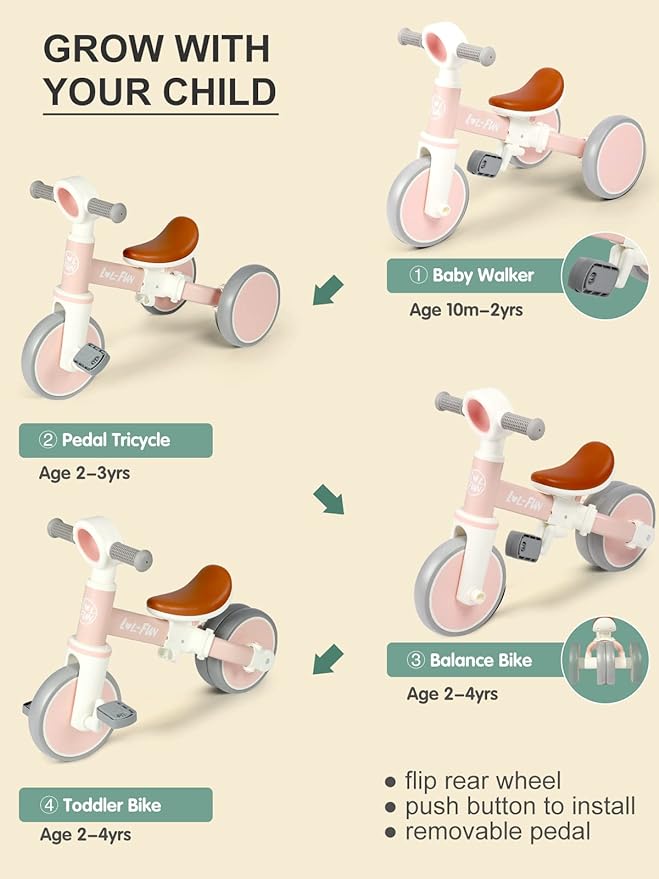 LOL-FUN Baby Balance Bike for 1 2 Year Old Boys Girls Gift, 4 in 1 Kids Tricycle for Toddlers 1-3 with Easy Assembly Removable Pedal