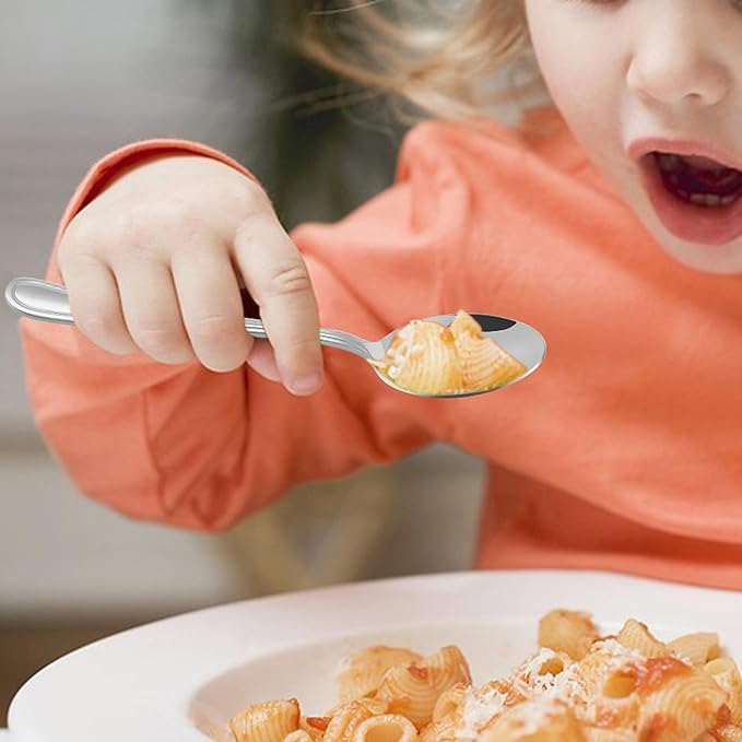 • Smooth edges, smooth edges all around handle and surface without burrs ensures safety of kid daily use, looks like dad and mum’s cutlery will encourage toddler to eat independently