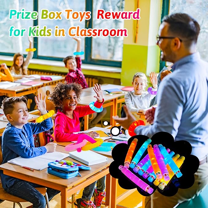 - Classroom Treasure Prize Box Toys for Kids- Glow party favors bags best as classroom treasure box prizes for kids toddlers. Our light up tube are soft and fun as return gift for kids birthday. Pop tubes make top notch party favor goody bags, pinata fillers, Halloween decorations Christmas party favors, stocking stuffers, secret santa & hottest basket stuffings for boys and girls.