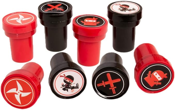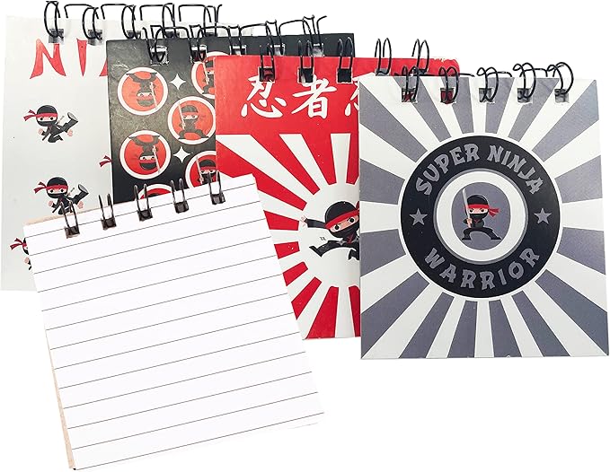 - 12 notepads with a ninja themed designs and 12 stamps.