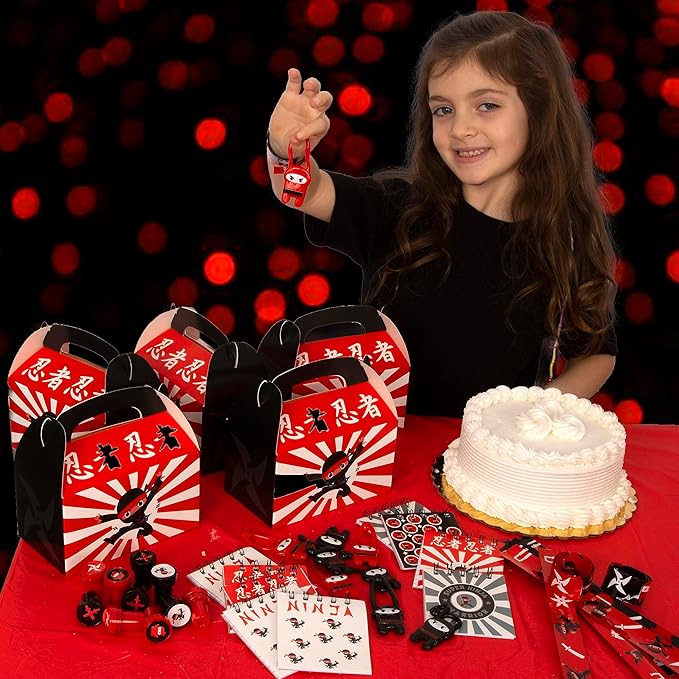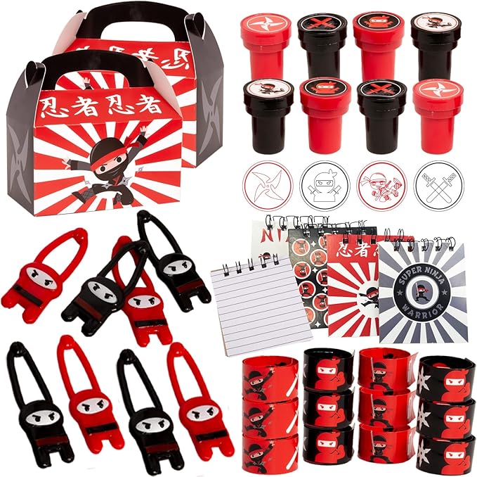 - This Ninja Party Decorations Favor Set include 12 party favor boxes, 12 notepads, 12 slap bracelets, 12 stamps, and 12 stretchy slingshot ninja toys. These party sets are an adorable addition to any ninja themed party!
