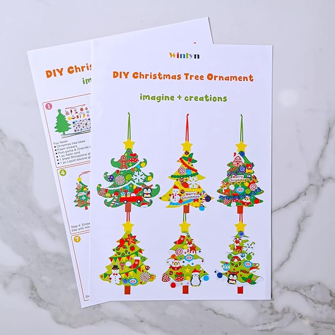 Winlyn 24 Sets Christmas Tree Ornaments Decorations Art Sets DIY Christmas Craft Kits Pine Tree Snowman Snowflake Penguin Foam Stickers Arts and Crafts for Kids Party Favors Home Classroom Activities