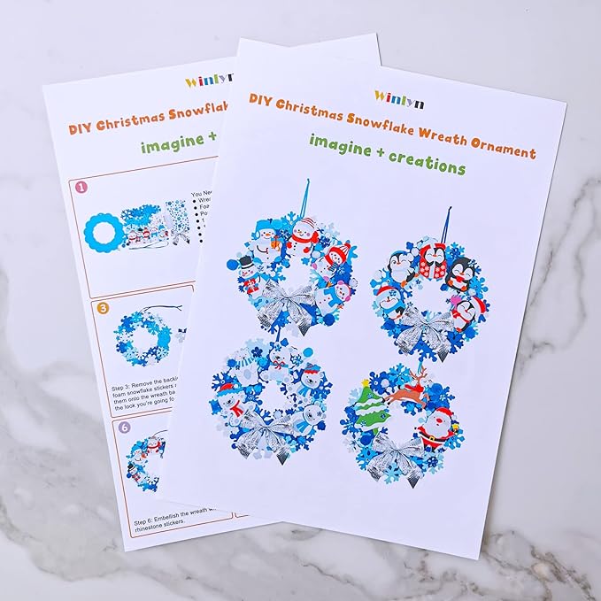 - 12 Sets Winter $ Christmas Wreath Ornaments DIY 3D Foam Winter Christmas Wreath Craft Kits: 12 pcs round Christmas wreath bases in blue, 340 pcs foam Christmas snowflake shaped stickers, 54 pcs foam self-adhesive Winter and Christmas prints foam stickers, 96 pcs craft pom-poms in winter colors, 1 sheet of artificial snowflake rhinestone stickers, 12 pcs Xmas silver bows, 12 pcs satin cords for hanging, 12 pcs adhesive wall hooks, 1 pc step-by-step instructions, 12 pcs xmas gift stickers.