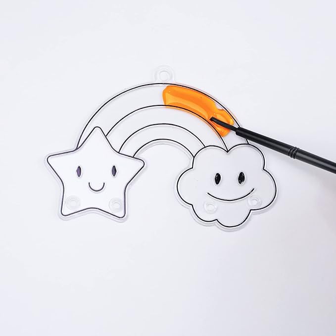 - Color: These transparent rainbow window suncatchers are shaped like a rainbow arching between two cute clouds and accented with a smiling sun or stars. The surface has pre-cut lines, so you can easily add different colors to the suncatchers. Suncatcher paints have 8 colors including red, orange, yellow, green, turquoise, blue, purple, and white. These translucent paints will recreate the classic colors of the rainbow arch as the sunlight shining through. Acrylic beads are in rainbow colors.