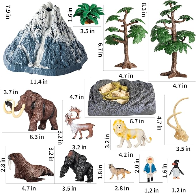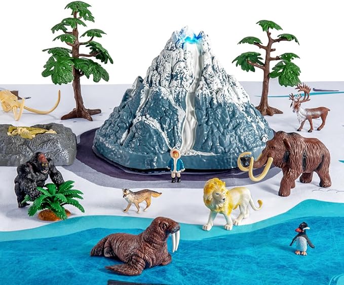 TEMI Prehistoric Animal Toys for Kids 3-5, Safari Animals Figurines and Snow Volcano Toy Set with Play Mat for Toddlers Mammoth, Lion and Gorilla, Educational Gifts for Toddlers 3 4 5 6 7 8 Years