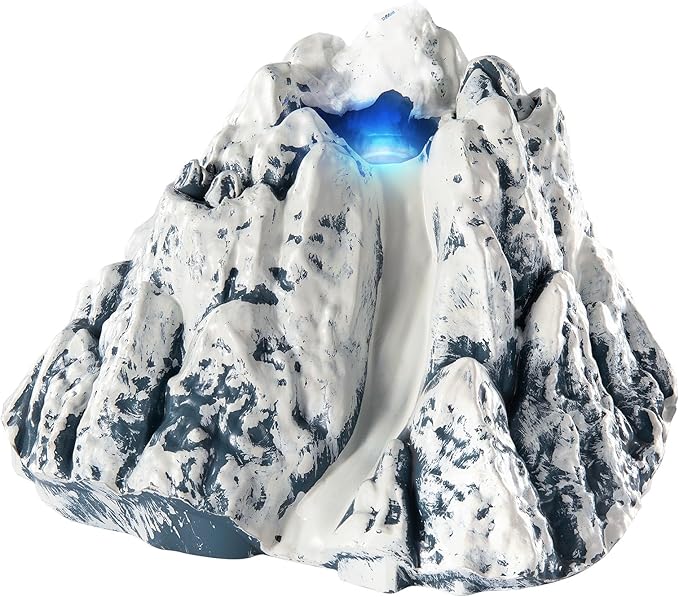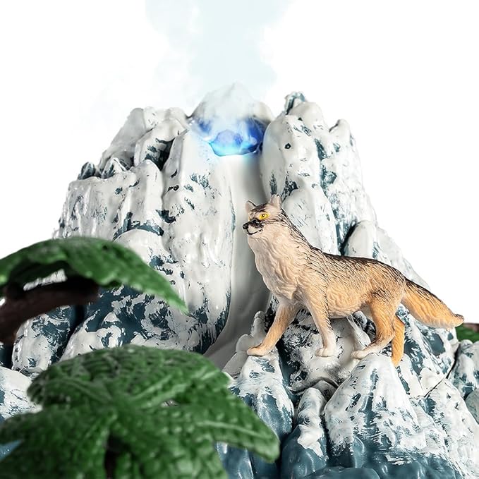 - 2-in-1 Volcano: The volcano has 2 parts, the bottom is hollow, which can store animals. It can mimic volcanic eruption. Just pour water into the tank inlet on the top of the volcano, turn on the switch. The mist will come out with lighting lava effect