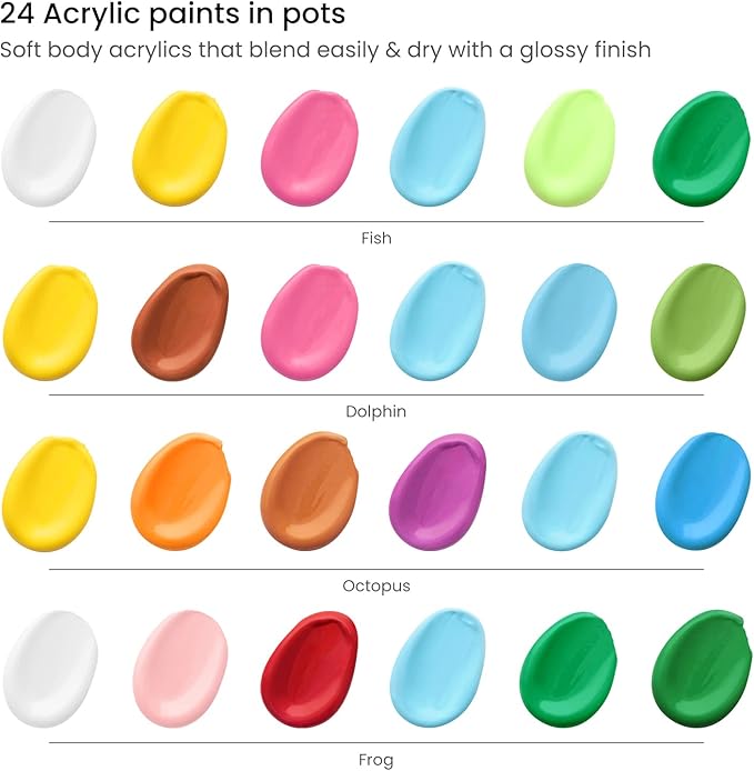 - Child-Safe Acrylic Paints: Encourage your child's love of the water creatures. Our kids’ art set features bright washable paints that are nontoxic and conform to ASTM D4236 safety standards and provide hours of creative fun. This will help your aspiring artist learn how to recreate the beauty of the water.