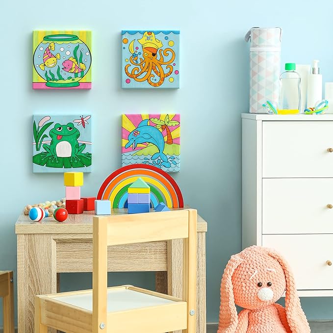 - Scenes of the Water: Bring the beauty of the aquatic creatures into your home. This acrylic paint set comes with four different canvases depicting: a dolphin, an octopus, fish in the aquarium, and frog. Your little artist can learn about colors and water life while enjoying some artistic fun.