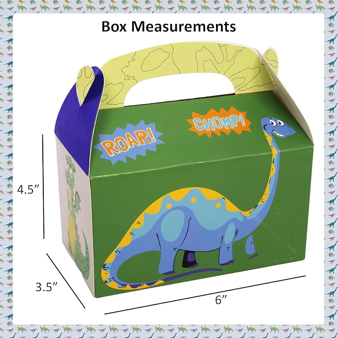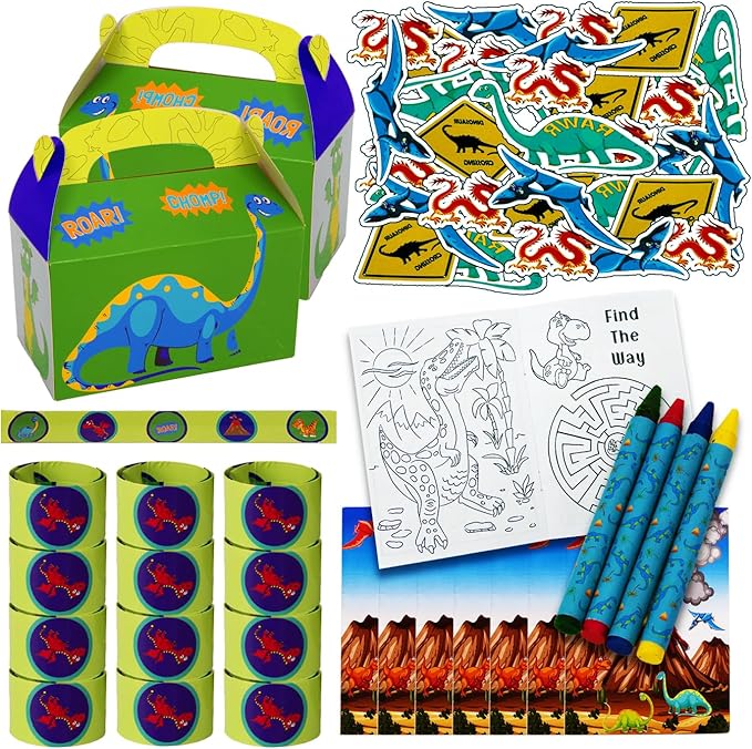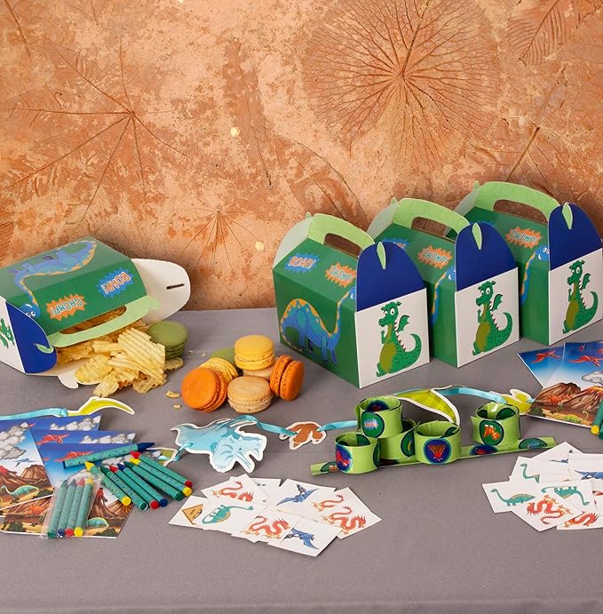 - This Dinosaur Themed Party Favor set includes, 12 party favor boxes, 12 coloring books, 12 sets of crayons, 12 slap bracelets and 144 tattoos. These party sets are an adorable addition to any dinosaur or dragon themed party!